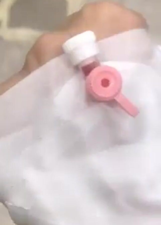 person's hand with an IV line inserted. The hand is wrapped in a white bandage, and the IV catheter is visible with a pink port. The background shows a tiled floor with a pattern of gray and white. The video appears to be taken from a first-person perspective.