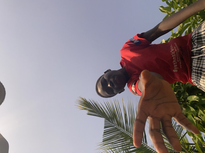 A low-angle photograph features a young male subject positioned against a clear blue sky and green foliage. The individual, wearing a red t-shirt with white text and black-and-white plaid shorts, extends his right hand with fingers splayed directly towards the camera. His head is tilted downwards, and he looks into the lens. A prominent palm frond is visible in the lower foreground. The scene is brightly lit by natural sunlight from an overhead source. The specific location within the city of Ado, Nigeria, cannot be determined from the visual evidence presented.