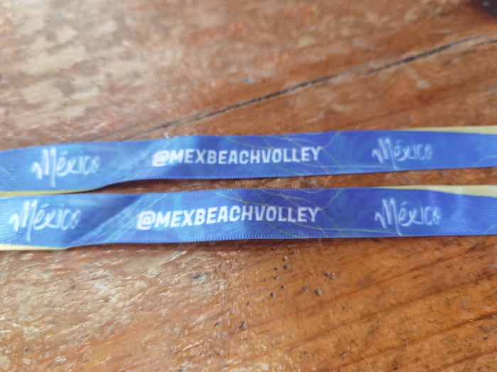 - "Two blue and yellow ribbon-like wristbands with the text "@MEXBEACHVOLLEY" and "México" lie on top of a wooden surface" by FM-JgPQm1, licensed under CC BY 4.0