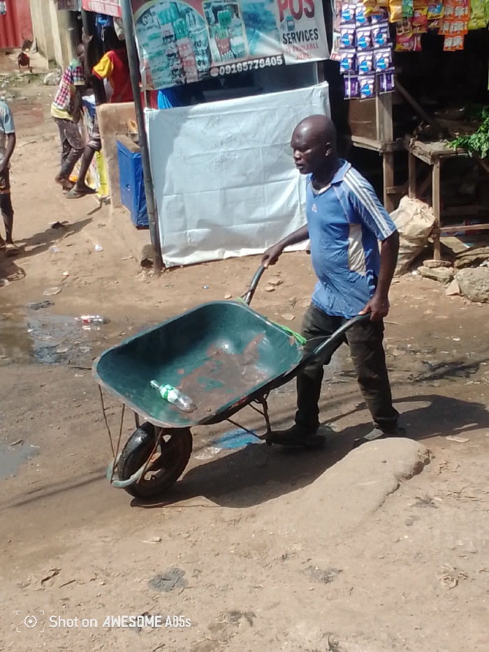 A male subject, with dark skin and a bald head, wears a blue short-sleeved polo shirt with white shoulder stripes, dark trousers, and dark footwear. He is actively pushing a green, single-wheeled metal wheelbarrow along an unpaved dirt road. Inside the wheelbarrow, a clear plastic bottle rests horizontally. The ground is uneven, consisting of packed dirt, sand, and minor debris, with some darker, possibly moist patches. In the background, to the left, another individual is partially visible, wearing a plaid shirt and dark trousers, walking further away. A light-colored chicken is also present on the far left. The background features several informal market stalls or commercial structures. One prominent vertical sign displays "POS SERVICES" and a phone number (09165779405), accompanied by images of packaged beverages and snacks. Below this sign, a large white tarp covers a lower section of a stall. To the right, a wooden stall displays stacks of colorful packaged snacks hanging from hooks and green leafy produce. A blue container is visible near the base of one of the structures. Strong sunlight illuminates the scene, casting distinct shadows. The scene depicts a bustling outdoor market or street area in Ifite-Awka, Nigeria.