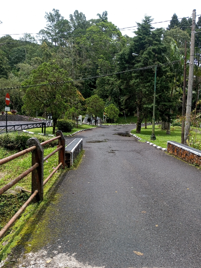 A paved asphalt road, appearing damp with puddles, curves through a densely vegetated outdoor area in Bijanwada, India. In the immediate foreground on the left, a rusty metal railing with four horizontal bars and concrete posts borders a grassy patch with mossy growth. To its right, a dark-topped concrete curb is visible. On the right side of the road, a low wall constructed of reddish-brown stones with a light-colored coping delineates the pavement from a manicured grassy lawn. The road continues into the midground, marked by a white curb featuring a black-and-white patterned top edge. On the left, a paved area branches off, displaying a red circular "no entry" sign with a white horizontal bar, and another unreadable sign below it. Several small to medium-sized trees with green foliage are planted in landscaped beds. On the right side of the road, a green lamppost with a single light fixture stands upright. The background is characterized by a dense forest of tall, green trees, including both conifers and broadleaf varieties, which extends up a sloping terrain. The sky overhead is overcast. Utility poles with power lines are visible on the far right, partially obscured by trees. No individuals or vehicles are present within the scene.