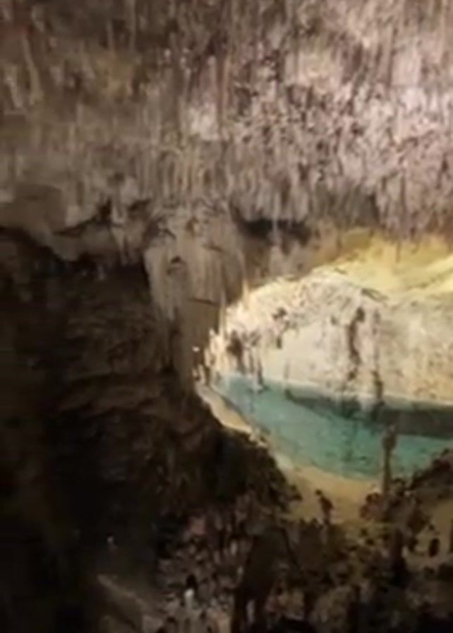 interior of a cave featuring a pool of clear, turquoise-colored water. The cave is illuminated, highlighting stalactites hanging from the ceiling and stalagmites rising from the cave floor. The walls are textured and rocky, creating a rugged and cavernous environment. The camera pans slightly, offering a wider view of the cave's interior, revealing more details of the rock formations and the unique geological features of the cave.