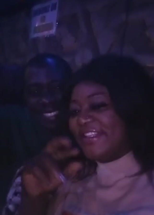 Two people, a man and a woman, are in a dimly lit indoor setting, possibly a club or bar, due to the low lighting and background music