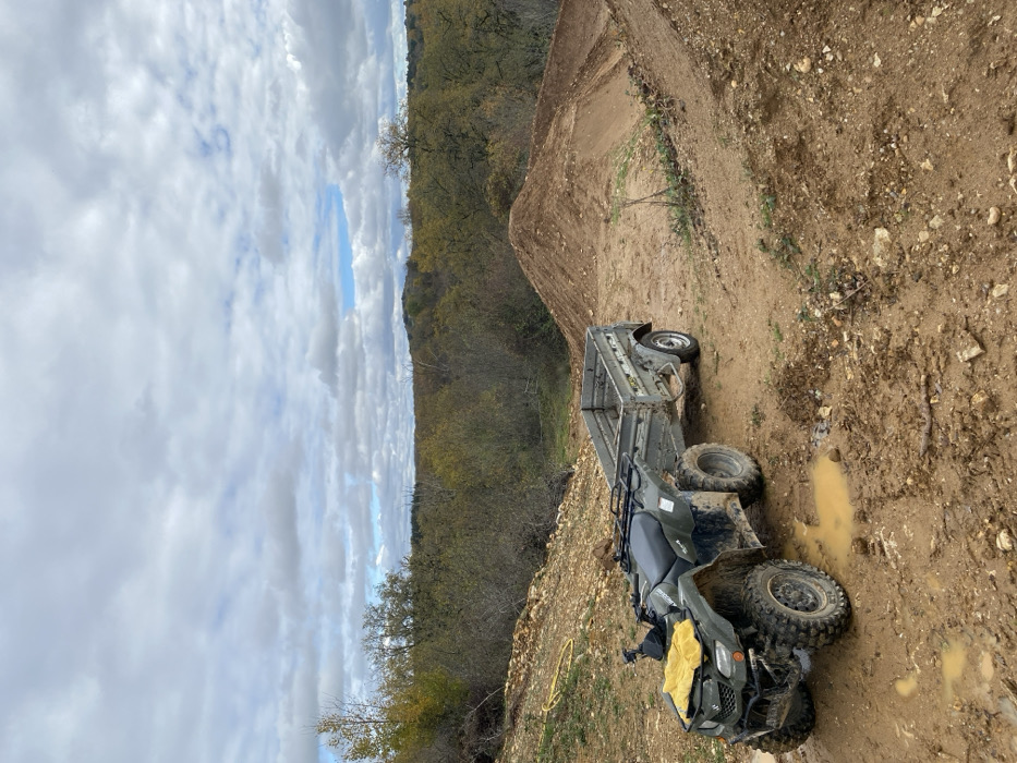 The scene, located in Saint-Denis-Catus, France, depicts an unpaved, rural landscape under an overcast sky with visible patches of blue. A mud-covered dark green Suzuki KingQuad all-terrain vehicle (ATV) is stationary on wet, rutted, reddish-brown soil. A yellow cloth is draped over the ATV's front utility rack. An empty, grey, single-axle utility trailer is hitched to the rear of the ATV. To the right, a large, freshly formed mound of reddish-brown soil is prominent, with another smaller earth mound visible further right. To the left, a slope of exposed, lighter-colored soil mixed with gravel features a coiled yellow garden hose. The immediate foreground ground is characterized by muddy puddles. The background consists of rolling hills covered by a dense forest displaying autumnal foliage. No individuals are present.