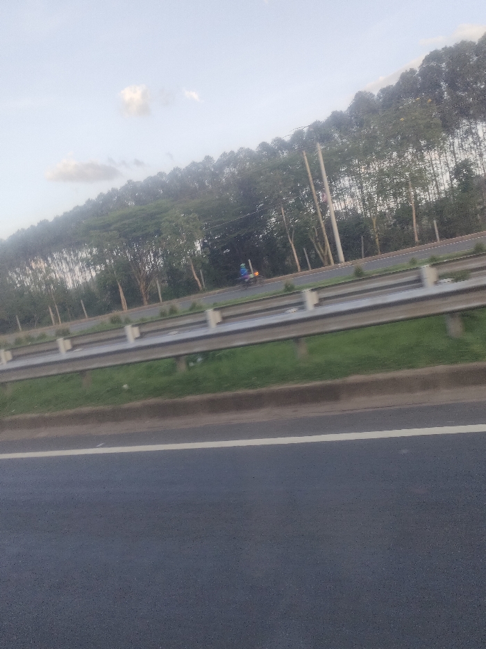 The image depicts a multi-lane highway scene in Juja ward, Kenya, under what appears to be an overcast or hazy daytime sky. In the immediate foreground, a dark asphalt road surface is visible, bordered by a solid white line on the left. A metal guardrail with white-capped vertical posts separates this foreground road from a grassy median strip. Beyond the median, another asphalt road section is present. On this more distant road, a single individual is observed operating a motorcycle, which exhibits a visible, illuminated orange-yellow light, likely a headlight. The rider's attire appears light-colored or blue. In the background, a dense and extensive line of tall, slender trees, possibly eucalyptus, forms a natural barrier across the horizon. Utility poles and power lines are visible amongst these trees. The overall environment suggests an open road or highway setting.