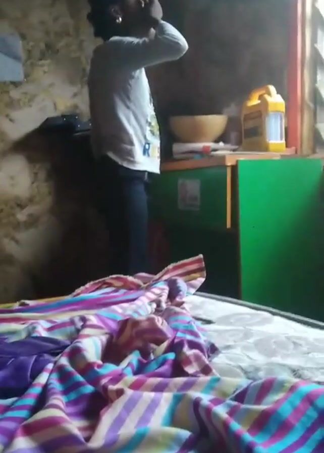 young woman in a room, coughing. She is wearing a long-sleeved white shirt with an image on it, dark pants, and earrings. Her hair is styled in small buns. She stands in front of a green cabinet near a window. On top of the cabinet are a wooden bowl, a yellow container, and a small item. After coughing, she looks at the camera briefly and then moves something from the cabinet. A bed with a striped blanket is in the foreground. The walls appear textured and the overall lighting is dim.