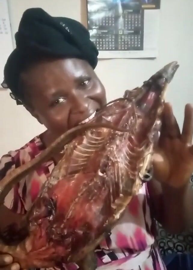 A person with dark hair covered by a black head wrap, wearing a pink and brown print dress, is holding up a cooked reptile with visible ribs and tail