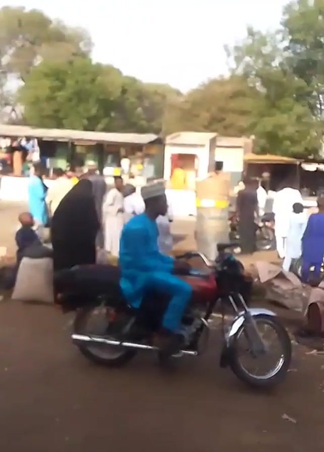 man wearing a blue shirt, pants, and a white cap sitting on a maroon motorcycle. He is stationary, possibly waiting. The scene is outdoors in what appears to be a bustling public area, possibly a market or a street. There are multiple people in the background, some wearing traditional clothing, moving around. Some people are standing in groups, others are seated. There are stalls or small shops visible in the background, and a large tree is on the periphery. The ground appears to be unpaved, possibly muddy. The camera is somewhat shaky, and the overall video quality is not very sharp. The audio captures a conversation, possibly in a language other than English.