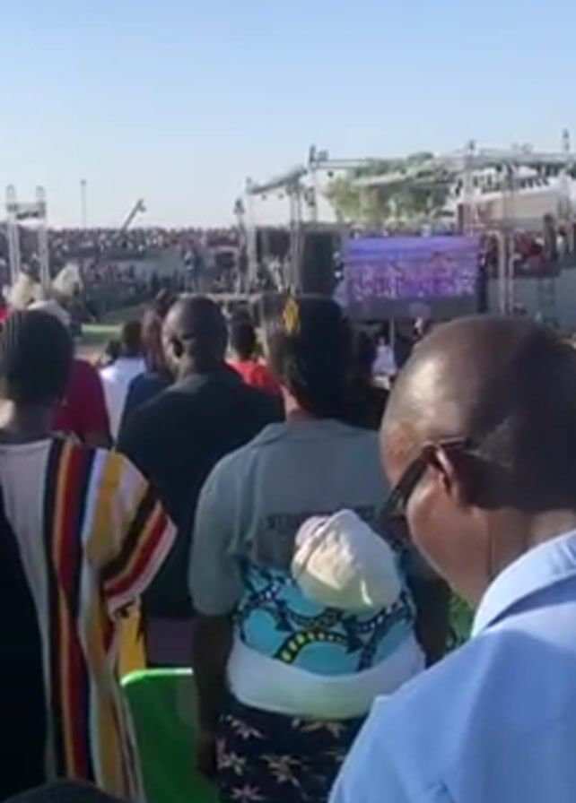 large crowd gathered outdoors in a stadium-like setting, presumably for an event. A stage is visible in the distance with a large screen displaying a video, perhaps of the performers or speakers. A crane can be seen towards the back of the crowd, possibly used for filming. The crowd appears to be a mix of ages and ethnicities. Some individuals are reading materials, possibly programs for the event. One woman in the foreground has a baby secured on her back with a patterned carrier. The sky is clear and blue, indicating a sunny day.