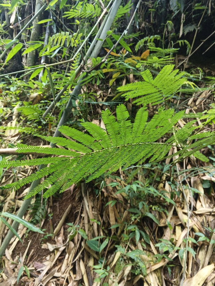 The image displays a close-up of dense tropical vegetation in Situm, Papua New Guinea. A large, bright green bipinnately compound leaf dominates the central and lower-right foreground, extending horizontally. Behind it, multiple light-colored bamboo stalks are visible, arranged vertically and diagonally among other green plant species, forming a dense backdrop. The ground is covered by a thick layer of dried bamboo leaves and other brown and tan organic debris. No people, subjects, or animals are depicted. The scene is naturally lit.