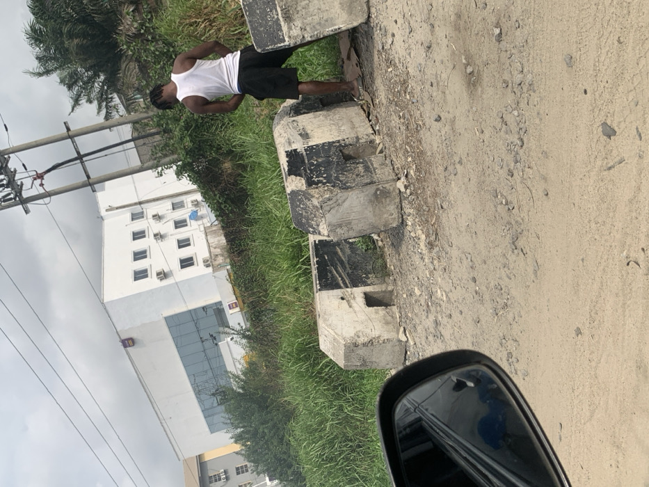 The scene depicts an outdoor urban environment in Jakande, Nigeria, viewed from the perspective of a vehicle's side mirror, visible in the lower-left corner. A young adult male, facing away from the camera, is standing behind two large, gray concrete road barriers with black markings, actively urinating into dense green foliage. He is wearing a white tank top, dark shorts, and light-colored flip-flops. The ground in the foreground is a rough, unpaved dirt and gravel surface. Behind the man and the vegetation, a large white building with multiple square windows and air conditioning units is visible. Further in the background, another building with a brown roof is partially visible on the left. Overhead, utility poles with power lines extend upwards against a cloudy sky.
