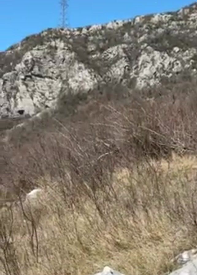 The camera pans upwards across a mountainous landscape under a clear blue sky. The foreground is a grassy area with scattered rocks and small bushes. The midground features a hillside covered with leafless trees and shrubs, transitioning to a rocky terrain higher up. An electrical transmission tower is visible on the ridgeline.