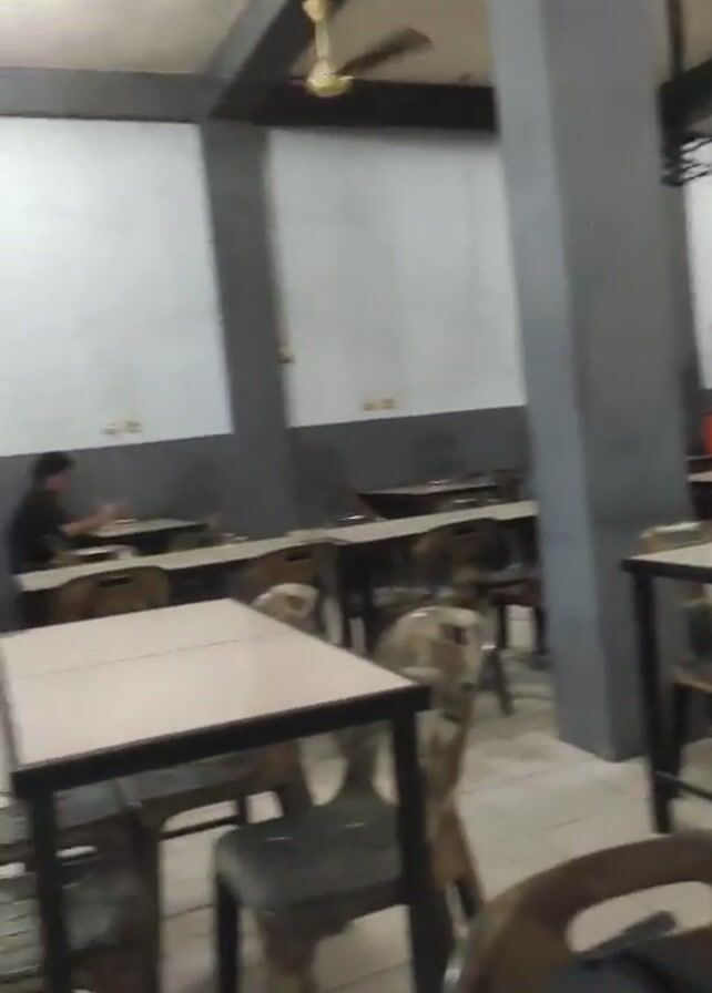 The camera pans across the interior of a casual dining space. The room has a neutral color palette of white, gray, and black, with square tiles on the floor. There are numerous square tables with black frames and light-colored tops, each accompanied by plastic chairs. A large gray pillar stands in the center of the room. In the background, through an open doorway, people are seated at green plastic tables and chairs in an outdoor area. The lighting is somewhat dim, and a ceiling fan is visible. One person is seated alone at a table, while several people are gathered in the outdoor space. A television is visible in the upper left corner.