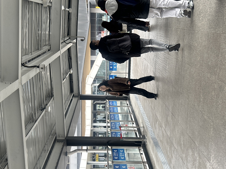 An outdoor scene displays several people standing near a building. The structure appears to be a covered walkway or station, supported by a steel frame and filled with glass. Signage in a foreign language is visible near the entrance. One person is wearing a brown jacket and dark pants, while others are dressed in dark jackets and light pants. The ground is paved with light gray tiles, and the lighting suggests it is daytime.
