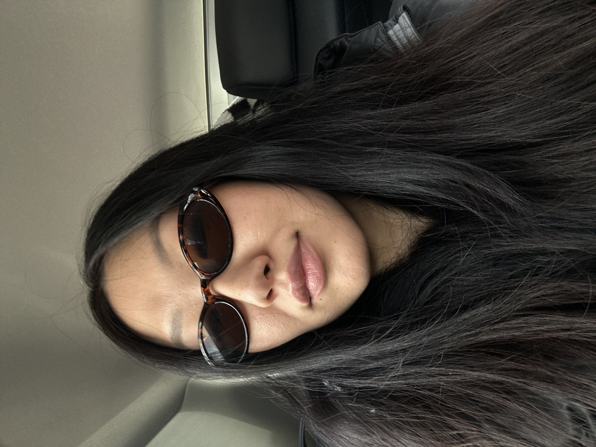 An adult female is depicted in a close-up, front-facing view, seated inside a vehicle in New Westminster, Canada. The subject, appearing to be of East Asian descent, has long, straight, dark hair. She wears oval, dark-lensed sunglasses with a brown tortoiseshell frame. Her lips are light pink. She wears a dark jacket, with a grey ribbed detail visible on the right side. The background shows a light grey vehicle headliner and a dark car seat headrest behind the subject's right shoulder. The lighting is consistent with an interior setting.