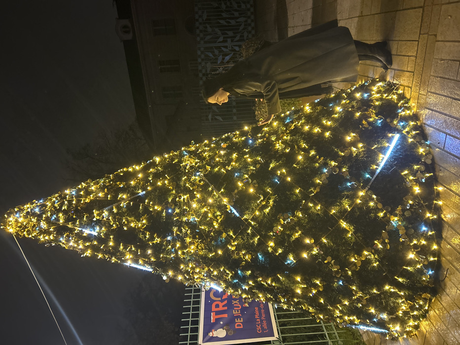 - "A person in a dark coat touches a large Christmas tree illuminated with warm yellow and white lights" by FM-CghfR2, licensed under CC BY 4.0