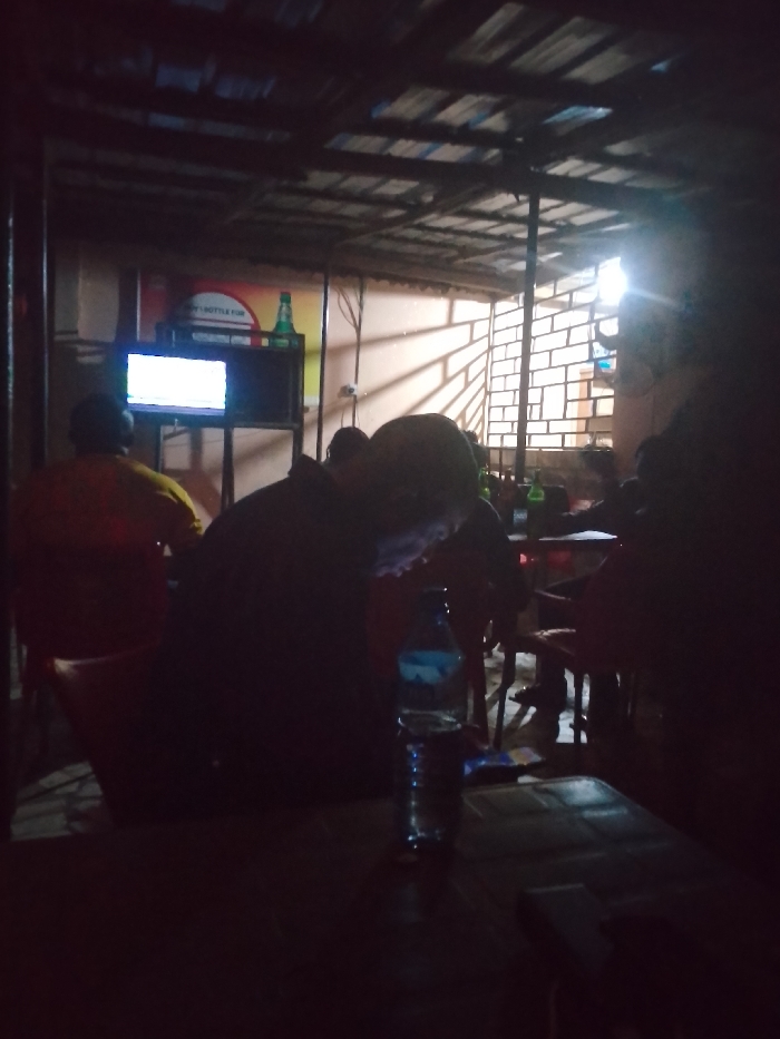 The image displays an interior scene within a building in Narayi, Nigeria, characterized by low light conditions and a corrugated metal roof supported by visible trusses. On the right, a wall features a window with a brick lattice pattern, through which natural light enters, casting distinct diagonal shadows across the wall. Several individuals are present, primarily viewed from behind or in silhouette due to the dim lighting. In the left mid-ground, a person wearing a yellow shirt is seated on a red chair, facing a television screen. In the immediate mid-ground, another individual is seated at a dark table, largely obscured by shadow. Additional shadowy figures are discernible further back, seated at tables. A television set, displaying a bright white screen with what appears to be text or a graphic interface, is mounted on a stand in the background. Above the television, a red and white banner is visible, partially reading "Y-BOTTLE FOR". Two green bottles are positioned on surfaces behind the television and near the window. In the foreground, on a dark table, a clear plastic bottle of water with a blue label stands upright next to a small, indistinct rectangular object. Red chairs are visible under the seated individuals. The overall environment suggests a casual gathering space, possibly a viewing center or social establishment.