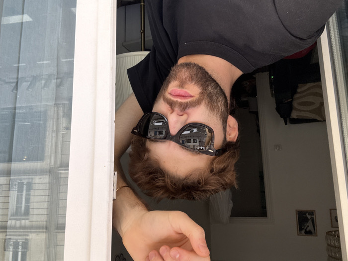 A male subject, with reddish-brown hair and a full beard, is depicted from the mid-chest up, wearing black Wayfarer-style sunglasses and a black t-shirt. He is positioned in an open white French window or balcony door frame, with his left arm raised and hand resting on the top frame. A thin gold bracelet is visible on his left wrist. The interior background to the left is dimly lit, showing a framed artwork on a wall, a dark piece of furniture with a patterned cushion, and part of a white lamp shade. The reflective surfaces of the sunglasses prominently display a street scene featuring classic Parisian Haussmannian architecture and a white vehicle. To the right, beyond the window frame, the exterior shows a light-colored building typical of Paris, with multiple windows and ornate iron balconies, situated across a street. A sheer white curtain is partially visible through a closed glass pane adjacent to the open window. This scene is located in Paris, France.