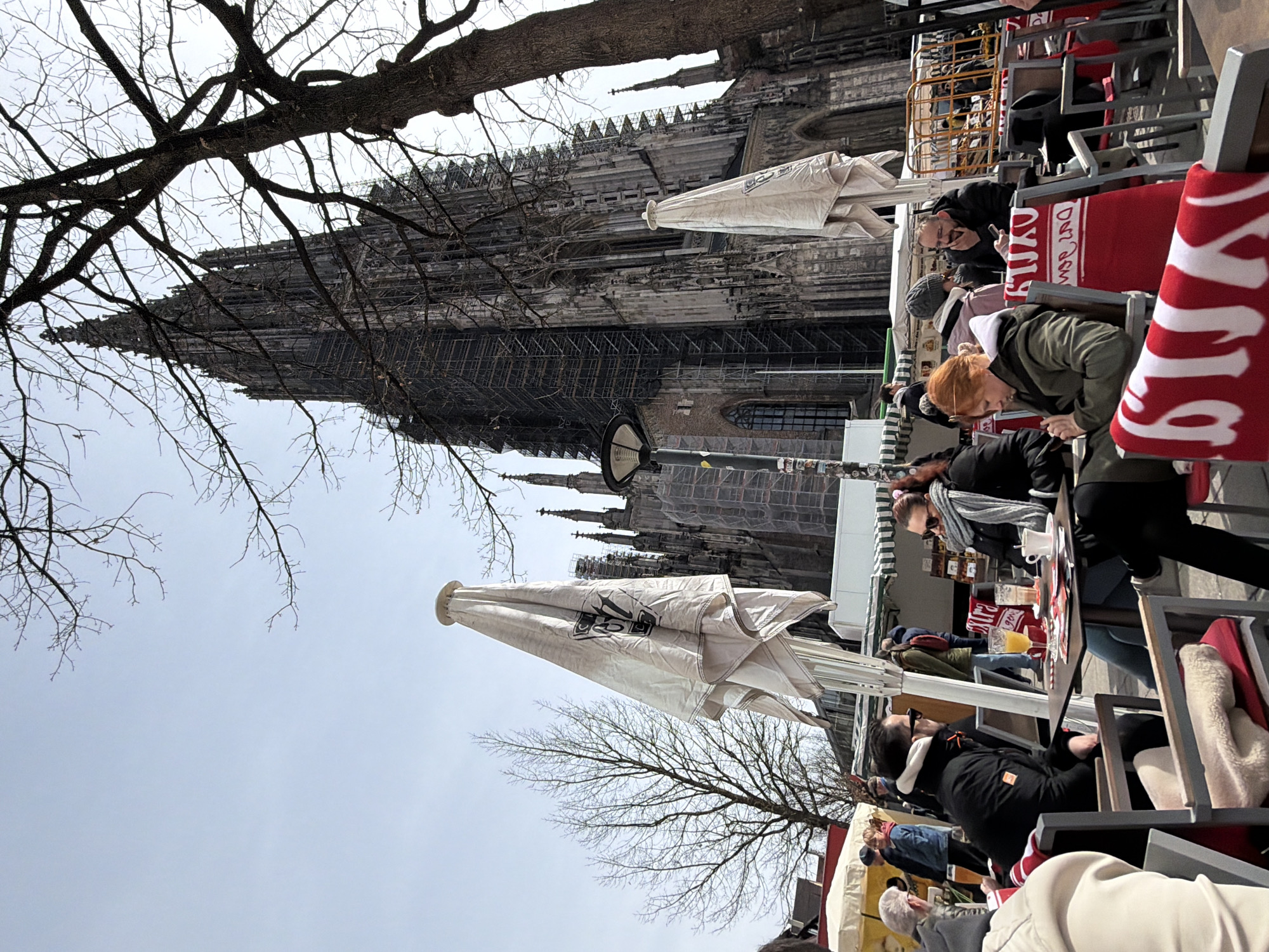 The image presents an outdoor cafe scene in Ulm, Germany, with the Ulm Minster (Ulmer Münster) dominating the background. The cathedral, a Gothic structure with a tall spire, exhibits extensive dark scaffolding covering large sections of its facade and the upper part of the spire, indicating renovation. The sky is clear and light blue. Several bare deciduous trees are visible, including a prominent tree trunk on the right side and a thinner tree on the left. In the foreground and mid-ground, an outdoor cafe is established. Dark-colored tables are surrounded by chairs featuring dark gray metal frames and red fabric seat and back cushions. Some chairs are draped with white, fleece-like blankets. Two large, closed outdoor umbrellas, cream-colored, stand upright; the central umbrella displays a dark, partially visible logo. A dark gray lamppost, adorned with stickers, is positioned to the left of the central umbrella. Behind the cafe seating, market-like structures include a cream-colored tent on the left and a stall with a green and white striped awning on the right. Multiple individuals are present in the cafe area. In the immediate foreground-left, a person in a light-colored jacket is partially visible, facing away. At a mid-ground table to the left, a man with dark hair, wearing a black jacket with a white fur-lined collar and dark sunglasses, is seated facing right. At an adjacent central table, a woman with reddish-brown hair, dressed in a dark green jacket over a light hoodie, looks down at a dark smartphone held in her hands. Opposite her, a woman with dark hair pulled back, wearing sunglasses, a black jacket, and a gray patterned scarf, is seated, looking left. On their table are a glass containing an orange liquid, a white coffee cup, and some papers or magazines. Further back, other patrons are visible, including a man with glasses and a mustache in a dark jacket, whose hand is on his chin. People are dressed in casual, warm attire, suggesting cool, sunny weather conditions.