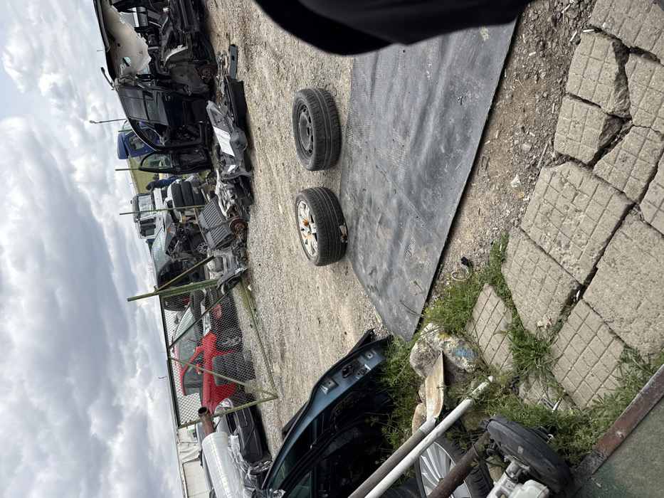 The image depicts an auto salvage yard located in Hrishteni, Bulgaria, under an overcast sky. The ground consists primarily of gravel and dirt, interspersed with patches of grass and broken concrete pavers in the immediate foreground. In the extreme foreground, a teal-colored car door is visible leaning on the left, near several white metal poles, a shovel, and miscellaneous car parts, including a bare wheel and a brake assembly. In the mid-ground, two car wheels with tires rest on the ground; one has silver alloy spokes, and the other is a black steel wheel. A large black rubber mat lies on the ground behind these wheels. Beyond this, a green chain-link fence runs across the scene, delineating sections of the yard. Behind the fence, multiple vehicles are in various states of disassembly and damage. A heavily damaged black minivan or SUV is prominent on the right, with its rear section significantly compromised. A red sedan, partially intact, is visible further left behind the fence. Numerous other vehicle frames and components are scattered throughout this section. In the background, a white semi-truck cab and trailer, along with a blue semi-truck cab, are parked. One individual, dressed in dark clothing, is standing behind the fence in the mid-ground, positioned between the black minivan and the blue semi-truck. The person appears to be observing or working within the yard.