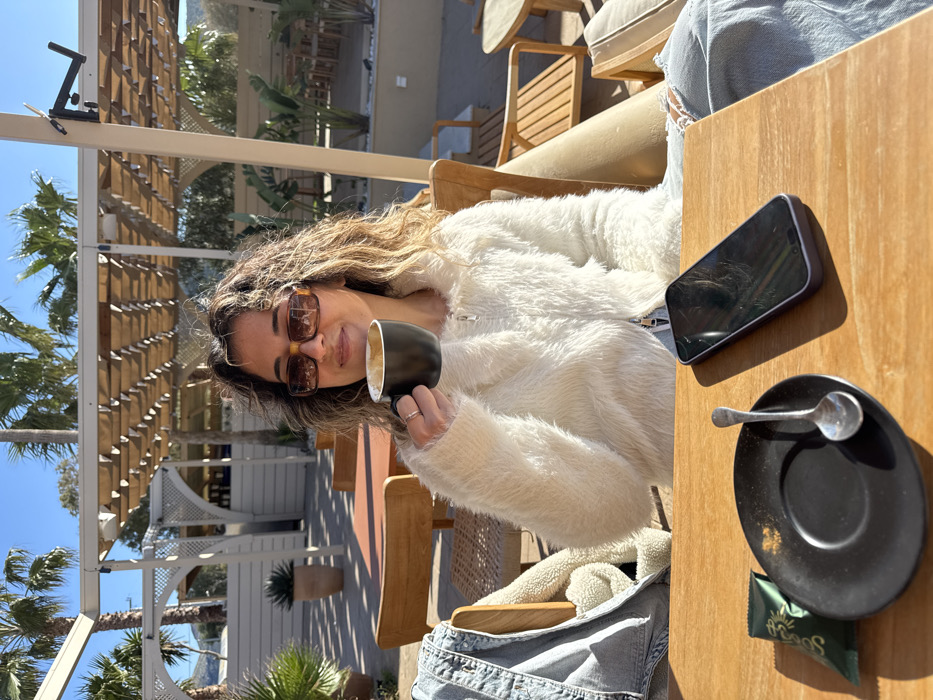 The scene is an outdoor cafe in the Anavissos Municipal Unit, Greece, under a clear, sunny sky. An adult female, with curly brown hair and wearing tortoise-shell sunglasses, a white fluffy zip-up jacket, and distressed light blue jeans, is seated at a wooden table. She holds a black mug containing a light-colored, foamy beverage near her mouth with both hands, looking forward with a slight smile. On the table, to her left, is a black saucer containing light brown residue, a small silver spoon, and a dark green packet. To her right, a dark-colored smartphone rests horizontally. The background features white wooden pergolas with horizontal slats, additional wooden tables and chairs, palm trees, and potted greenery, with distant hills visible under a bright blue sky. Distinct, short shadows indicate direct midday sunlight.