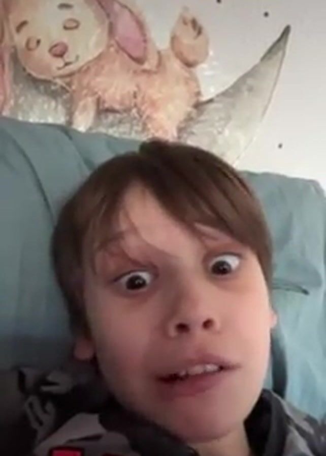 A young boy is seen from the chest up, laying on a blue pillow or cushion, facing directly into the camera. He has brown hair, fair skin, and is wearing a grey hoodie with what appears to be superhero-themed graphics. Behind him, there’s a wall decoration depicting a rabbit sitting on a crescent moon, painted in pastel colors. The wall also has small star decals. He is making exaggerated facial expressions, presumably to demonstrate how to make grimaces.