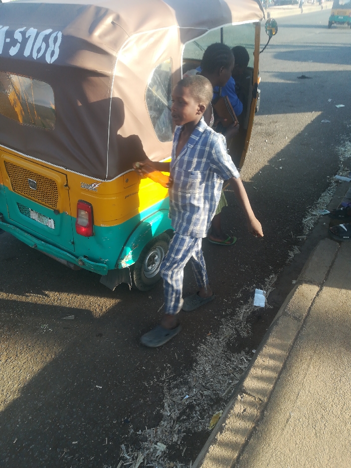 This image captures a street scene in Jos, Nigeria, during daylight. A yellow and turquoise three-wheeled auto-rickshaw, featuring a brown canvas canopy with "NA-5168" stenciled on it and a partial "PLATEAU STATE" registration plate visible at the rear, occupies the left-center of the frame. The vehicle's rear body displays signs of wear and scuffing. A young dark-skinned boy, appearing to be between 6 and 10 years old, stands alongside the auto-rickshaw's rear, extending his right hand towards the vehicle. He wears a blue and white plaid short-sleeved shirt and matching long pants, complemented by dark gray slip-on clogs. Inside the auto-rickshaw, at least two passengers are visible; one is an adult female in a blue top holding a brown bag, positioned towards the front of the passenger compartment. The auto-rickshaw is situated on a dark paved surface next to a concrete curb that runs along the right side of the frame. Light-colored debris, resembling wood shavings, is scattered along the roadside adjacent to the curb. Strong sunlight casts distinct shadows across the scene.