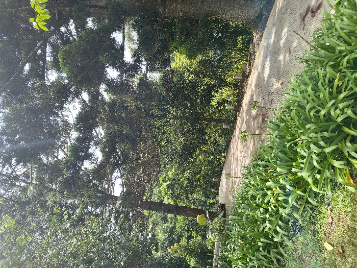 A pathway curves through a garden, lined with dense green foliage. Tall trees with intricate branches create a canopy, dappling the path with sunlight. Lush green plants grow along the path's edge. The stone path winds into the distance, hinting at a serene and well-maintained natural setting. The light filtering through the trees adds depth and contrast to the scene.
