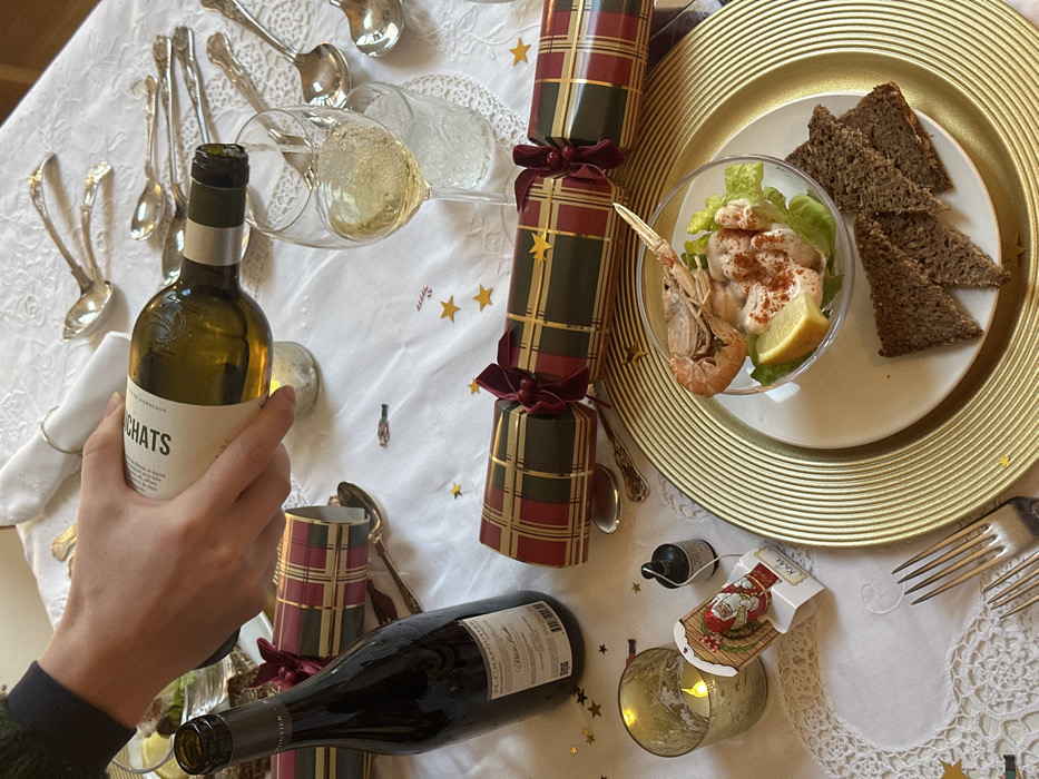 The scene depicts a dining table laid for a festive meal within a residence in Wealden, United Kingdom. A light-skinned hand, wearing a dark green knitted sleeve, is observed pouring white wine from a bottle labeled "CHATS" into a clear stemmed wine glass, which is approximately one-third full. The table is covered with a white tablecloth adorned with scattered gold star confetti. Three Christmas crackers, featuring a red and dark green tartan pattern with gold stripes and red velvet bows, are visible. A dark glass bottle, identified as "M. CHAPOUTIER," stands nearby. Ornate silver spoons and a white napkin in a silver ring are arranged on the table. A place setting in the foreground includes a gold-rimmed charger plate topped with a white dinner plate. On this plate rests a clear glass bowl containing a prawn cocktail, comprising lettuce, pink prawns with a red sauce, a lemon wedge, and a single whole langoustine or large prawn positioned on the rim. Four triangular slices of dark bread are placed beside the bowl. Additional items on the table include a small gold mercury glass votive holder containing an LED candle, a decorative Santa Claus sleigh bearing the name "Kate," a small black bottle-shaped novelty item, and a partially visible silver fork. A second clear glass, a tumbler with ice, is positioned near the wine glass.