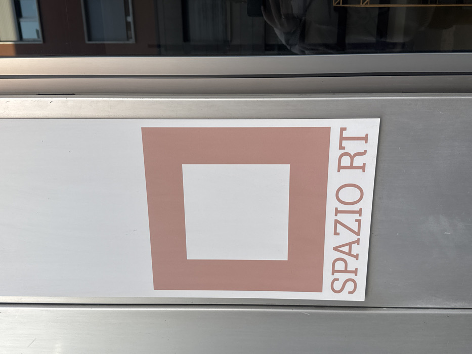 The image presents a close-up, slightly angled view of a white rectangular sign affixed to a vertical, brushed silver-colored metal panel, likely a door frame or building facade. The sign features a geometric logo comprising a prominent pinkish-brown square outline encompassing a white inner square. Below the logo, the text "SPAZIO RT" is displayed in matching pinkish-brown sans-serif capital letters. To the right of the metal panel, a dark reflective glass surface, possibly a window or door, captures a reflection. This reflection reveals a multi-story building with a reddish-brown brick or painted facade and two visible rectangular windows, one of which has its blinds partially lowered. A partial reflection of an individual, likely the photographer, wearing a light-colored long-sleeved top and holding a device, is discernible in the lower right quadrant of the reflective surface. The scene is illuminated by natural light, suggesting an outdoor urban environment within the city of Milan, Italy.