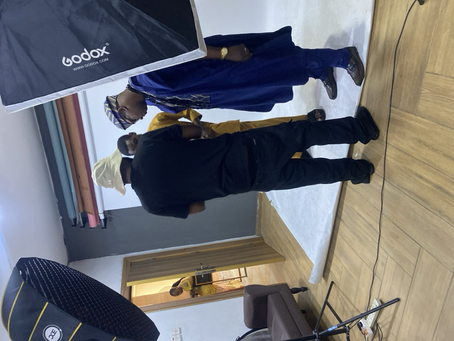 A photography studio scene shows three people posing on a white backdrop. One is in a blue traditional outfit, the next is in yellow, and the third has a black outfit. Studio lighting equipment, including a Godox softbox, is prominently displayed. The room has light wooden floors and a glimpse of another room can be seen through a doorway, showcasing a seated individual in a colorful dress.