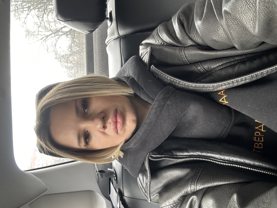 A female individual is seated in the rear passenger seat of a vehicle, facing forward, in Rostov-on-Don, Russia. She has short, straight blonde hair and a neutral expression, featuring a septum piercing and prominent lips. She is wearing a black faux leather jacket over a dark-colored hooded sweatshirt, which has partially visible orange-gold Cyrillic text, including "ТВЁРДАЯ". A dark scarf or neck warmer is visible around her neck. The vehicle's interior features black leather seats and a visible seatbelt buckle receiver on the left. Through the rear window, an overcast sky is present above bare deciduous trees, indicating a cool season. A light-colored building or wall is visible in the upper left background, behind the car.