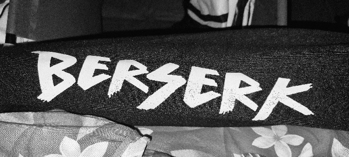 close-up of a black garment with the word "BERSERK" printed in white on the sleeve