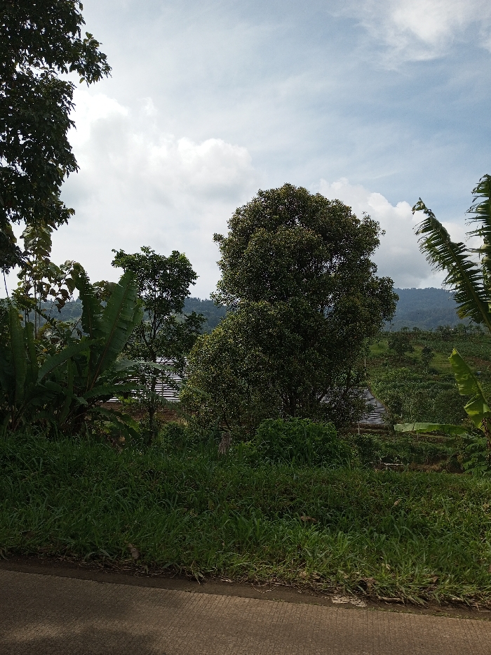 The image displays an agricultural landscape situated in Matale, Sri Lanka. In the immediate foreground, a dark grey asphalt or concrete road surface occupies the lower fifth of the frame. Adjacent to the road, a dense strip of vibrant green grass and herbaceous plants forms a natural border, extending into the mid-ground. The mid-ground reveals a mix of natural vegetation and cultivated land. On the left, a large, dark-leaved tree partially frames the scene, with distinct broad leaves, characteristic of banana plants, visible centrally on the left. Further right and center, numerous other trees with dense, dark green canopies are scattered amongst sloping agricultural fields. These fields feature visible rows of low-lying crops and several structures, possibly covered plant beds, identifiable by light-colored sheeting. In the background, distant, vegetated hills or mountains extend across the horizon, appearing somewhat hazy. The upper portion of the image shows a partly cloudy sky, with patches of blue visible between expansive white stratocumulus clouds. No human or animal subjects are present, and no specific actions or interactions are depicted within the scene.