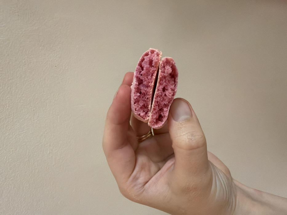 - "A hand holds a split, pink macaron against a pale background" by FM-k41Xm2, licensed under CC BY 4.0