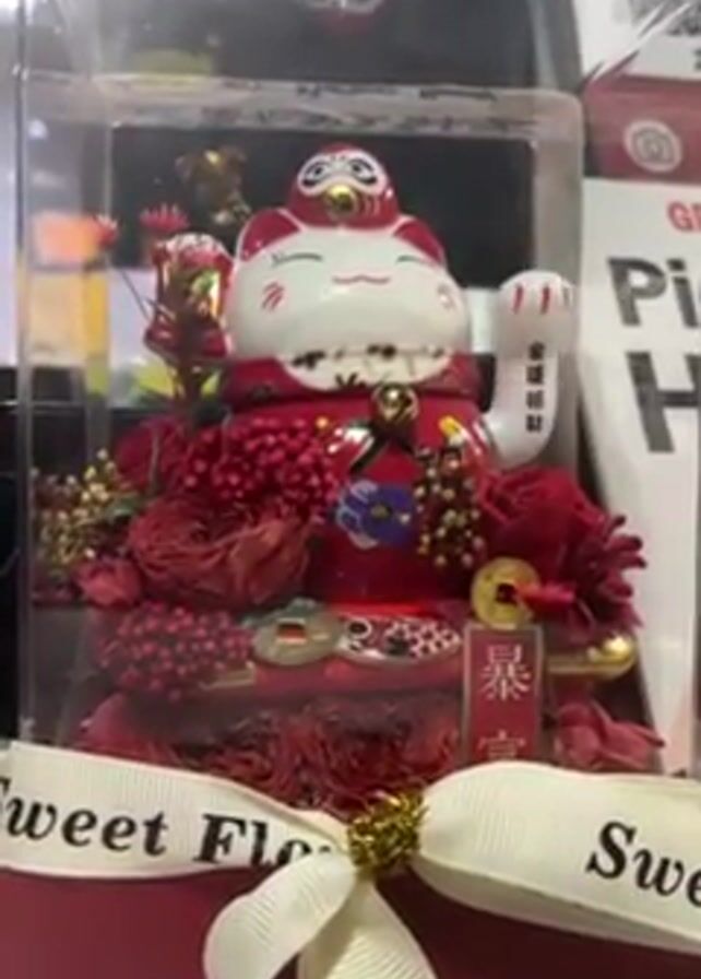 red and white maneki-neko, or beckoning cat, in a clear plastic display case. It is surrounded by red flowers and gold embellishments, and the box is tied with a white ribbon that reads "Sweet Floral." The background is cluttered, with what appears to be business-related materials including a sign for "Pick Up Here." The camera remains stationary throughout the short video.