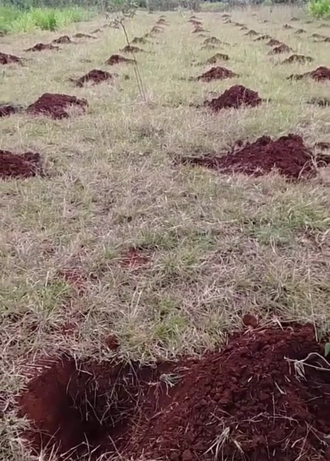 field with numerous holes dug in the ground, arranged in rows. Piles of dark, reddish-brown soil are next to each hole. The ground is covered with dry grass and some green vegetation. In the background, trees and shrubbery line the horizon under a cloudy sky.