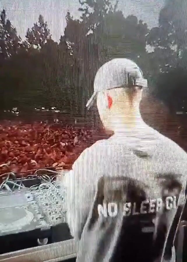 A person is operating a DJ mixer at an outdoor music event. The individual is wearing a baseball cap and a gray shirt with black graphics on the back. A large crowd is visible in the background, with trees behind them. The person raises one arm up in the air. A haze of light and smoke fills the area in front of the crowd. The mixer has various knobs, dials, and turntables.