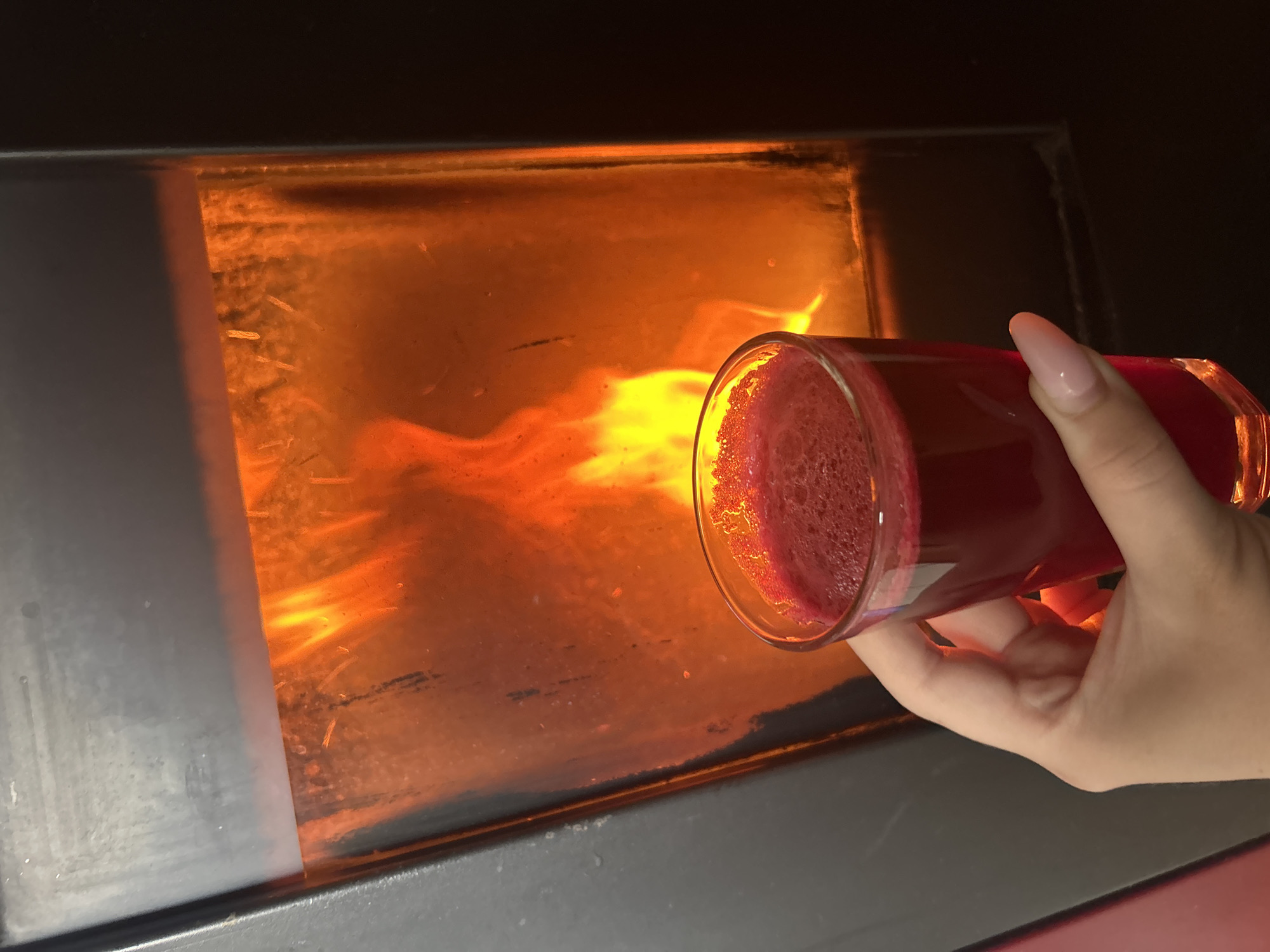 The image depicts an indoor scene within the city of Kumanovo, North Macedonia. The primary subjects are a human hand holding a beverage in front of an active fireplace. In the background, a dark, rectangular, modern enclosed fireplace or wood-burning stove occupies the majority of the frame. Its central glass panel displays active, bright orange and yellow flames, indicating an ongoing fire. Subtle streaks and residue are visible on the exterior surface of the glass panel, possibly from smoke or heat. The frame of the fireplace is dark, appearing to be black or dark grey metal. In the foreground, a fair-skinned human right hand grips a clear, faceted glass tumbler. The hand exhibits manicured fingernails with a light pink or nude polish, shaped ovularly. The glass contains a dark red liquid with a frothy layer on its surface, consistent with a freshly prepared juice or similar beverage. The hand is holding the glass steady, presenting the beverage in front of the actively burning fireplace. The ambient lighting is primarily derived from the glow of the flames, with the immediate surroundings of the fireplace appearing dark.