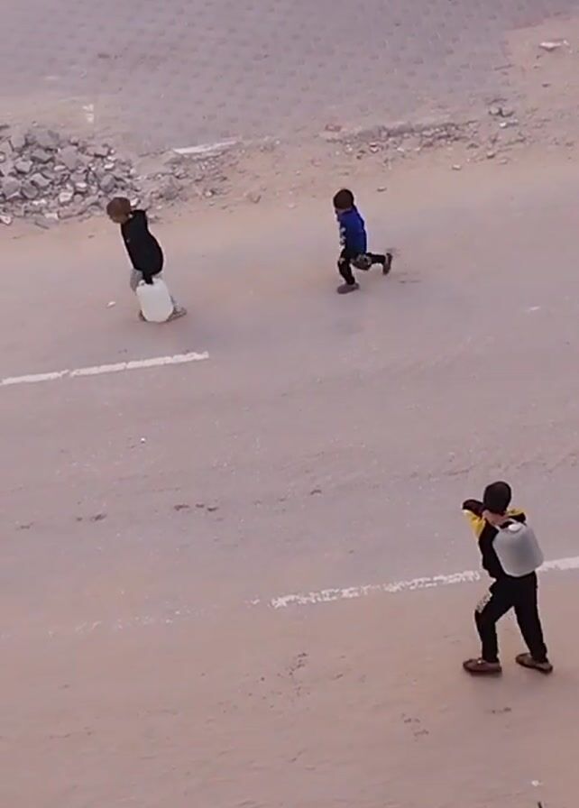 Three children are walking along a street. The street appears to be paved but somewhat dirty and worn, with debris along the edges. One child carries a white plastic container, possibly a water jug. Another child wears a blue shirt. The third child wears a jacket with yellow accents and carries a similar container on their back. The children are walking on the right side of the road. The buildings in the background appear partially constructed or damaged. The sky is not visible.