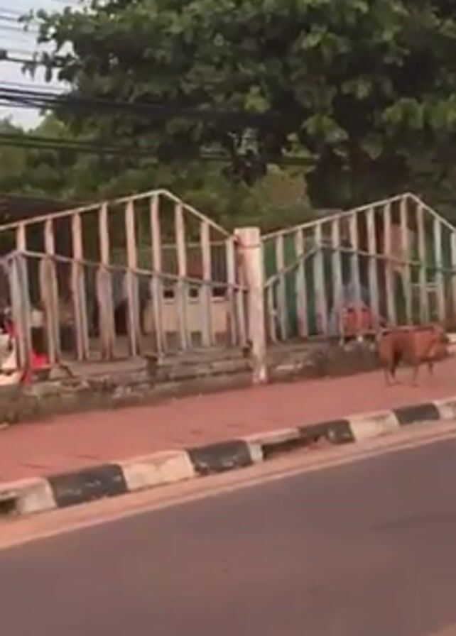 The video depicts a tan dog walking along a red and black-striped sidewalk, near a road. A metal fence stands to the side of the sidewalk. The footage appears to be taken from a moving vehicle. Behind the fence, greenery and a building with utility poles are visible. The sky appears to be light, suggesting either early morning or late afternoon.