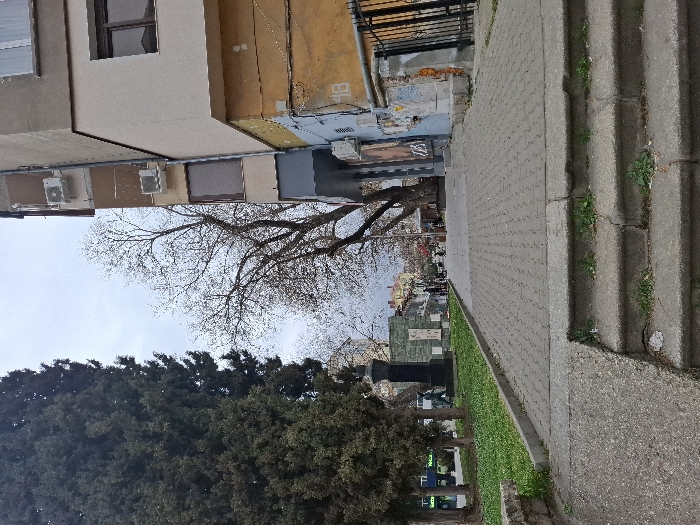 The image depicts an urban scene in Stara Zagora, Bulgaria, under an overcast sky. In the immediate foreground, three weathered concrete steps ascend to a paved pedestrian walkway. Weeds and small plants grow within the cracks of the steps and along their edges; a small piece of white debris rests on the second step. To the left of the walkway, a landscaped area features a dense row of tall, dark green evergreen trees, possibly cypress, bordering a patch of bright green grass. Partially obscured by the trees and grass is a dark-colored statue on a pedestal, forming part of a monument. Further along this green space, a light-colored structure with graphic elements is visible. To the right, a multi-story building rises with a light-tan upper facade and multiple external air conditioning units mounted on its side. Brown-framed windows are visible. The lower section of the building exhibits signs of distress, with discolored yellow-orange insulation or crumbling plaster, blue paint, and graffiti. A dark metal fence or gate is present at the building's base on the far right. A large deciduous tree, currently bare of leaves, stands in front of this building, its branches extending upwards. The paved pedestrian walkway, constructed of interlocking concrete pavers, extends into the mid-distance. Several indistinct human figures are observed walking along this distant section of the pathway. The background consists of additional urban structures and trees beneath the bright, overcast sky.