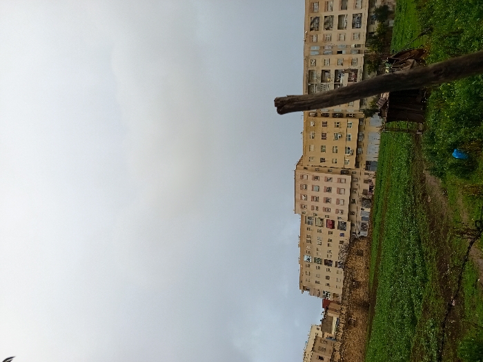 The image displays an urban periphery scene in Fez, Morocco, under an overcast, light grey sky. The foreground features a verdant field of low-lying green crops, with visible patches of dark, moist earth and subtle pathways. A prominent, thick, rough-hewn wooden post, appearing to be a natural tree branch, stands vertically in the lower right. Adjacent to this post, a small, dark, makeshift structure or shack, constructed from salvaged materials, is situated within the field. A bright blue plastic bag rests on the ground near the shack. A low, dilapidated stone wall of light brown masonry traverses the midground, separating the cultivated field from the background structures. Beyond this wall, a cluster of multi-story residential apartment buildings dominates the background. These buildings are light beige to tan in color, characterized by numerous rectangular windows, many equipped with external roller shutters (some open, some closed), and small balconies. Air conditioning units are visible on some exterior walls. No discernible individuals are present or performing specific actions within the frame.