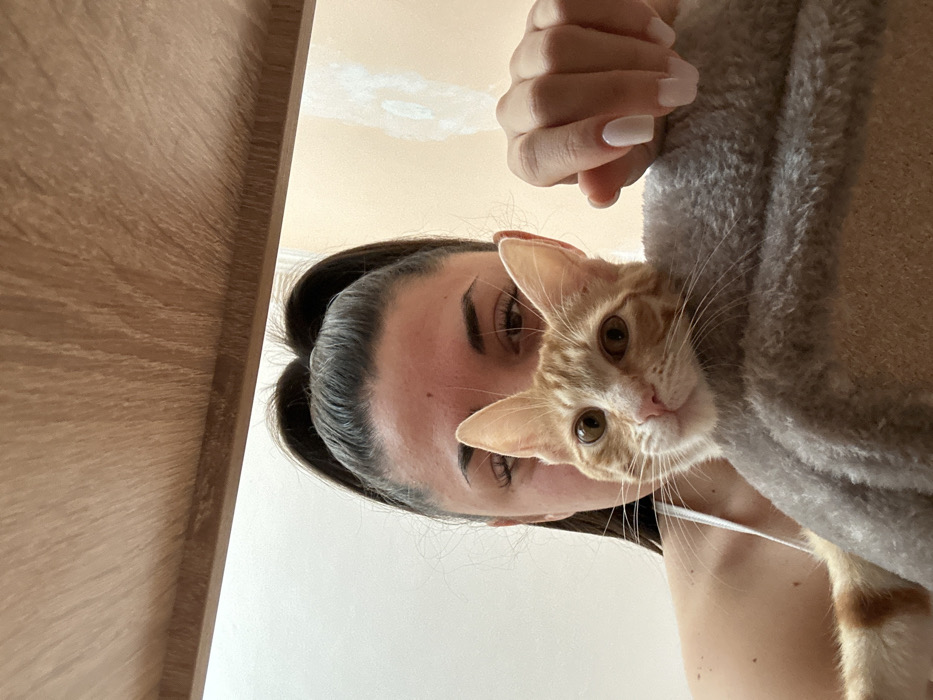 - "The image depicts an indoor scene featuring a female individual and an orange and white tabby cat" by FM-sWU563, licensed under CC BY 4.0