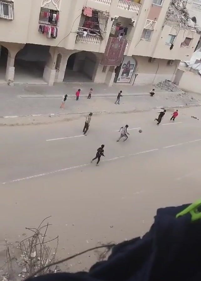A high-angle shot shows a group of children playing soccer on a paved street in front of a multistory building