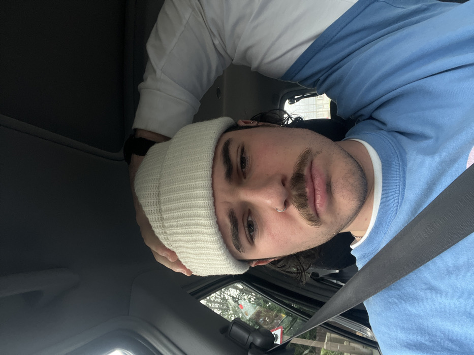 A young adult male, with a light complexion, dark hair, dark eyebrows, and a prominent mustache, is depicted in a medium close-up, seated inside a vehicle. He wears a ribbed white knit beanie, a light blue long-sleeve shirt layered over a white shirt, a silver hoop nose ring in his left nostril, and a silver earring in his left ear. A dark seatbelt crosses his chest and left shoulder. His right hand is raised, fingers resting on the top of his beanie. The vehicle's interior features a dark headliner and an overhead sunroof. Through the driver's side window, blurred green foliage is visible. A dark suction cup mount and a partially visible white sign with red markings are affixed to the windshield. Through the passenger side window, indistinct structures are visible in the distance. The scene is located in Unknown, Unknown.