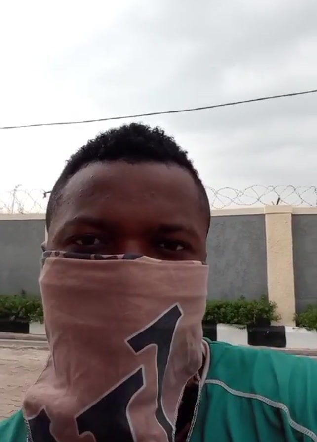 A medium close up shot of a person from the chest up. The person has short curly hair and brown skin. They are wearing a green shirt and a beige mask. The mask covers most of the person's face. Only their eyes are visible. Their eyes are open and looking at the camera. Their right hand is raised and making the peace sign. Behind them is a gray wall topped with barbed wire. In front of the wall are a few bushes in black square planters. The ground is made of red brick. The sky is overcast.