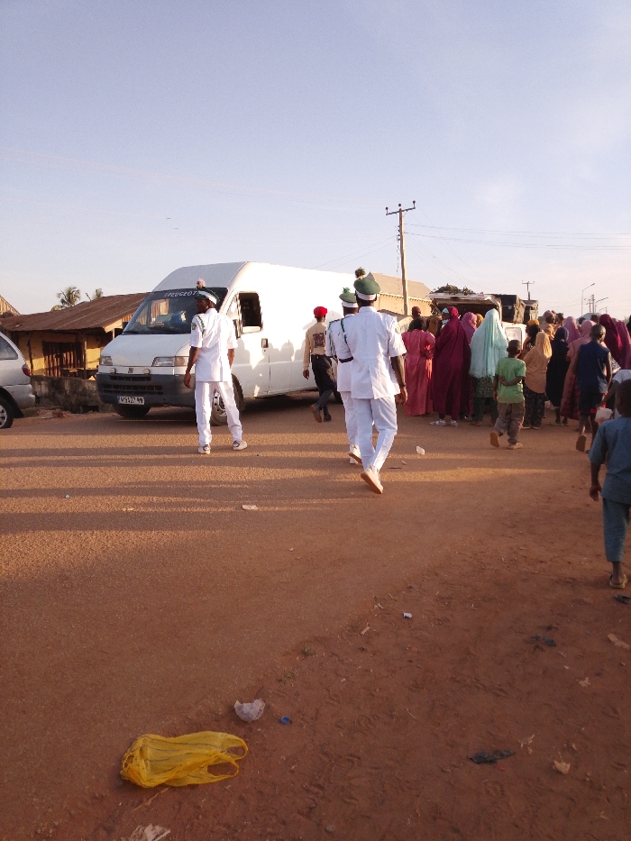 This image depicts a public thoroughfare in Mangu Town, Nigeria, under a clear, light blue sky. The ground consists of unpaved reddish-brown dirt, littered with items including a crumpled yellow plastic bag and other small debris. A white Peugeot van, identified by "PEUGEOT" on its front and partial license plate "M 1527 AW," is parked on the left side of the dirt road. A silver vehicle is partially visible on the far left. In the mid-ground, three individuals in white uniforms, featuring dark green/black epaulets and caps with red plumes, are present. One uniformed male stands facing away from the camera, near the driver's side of the white van. Two other uniformed males walk away from the camera towards the right, with one wearing light brown shoes. Another male, possibly in a light brown uniform, walks between the uniformed men and the van. To the right, a crowd primarily composed of women and children is gathered or walking. The women wear various traditional garments and head coverings in colors such as maroon, light blue, beige, and pink. Several children are interspersed within the crowd, including one in a green shirt and brown pants, and another in a light blue garment visible in the immediate foreground on the far right. A wooden utility pole with wires stands in the background to the right of the van. Buildings with light-colored corrugated roofs and wooden walls are visible in the background on the left. Long shadows are cast on the ground, indicating direct sunlight.