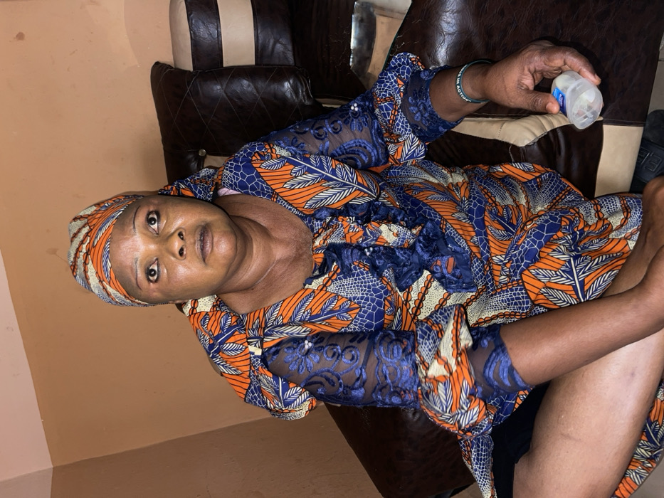 An adult female is seated indoors in Unguwar Gabas, Nigeria. She has dark skin, with a faint discoloration visible above her left eyebrow and slight redness around both eyes. She is wearing a patterned headwrap and a long-sleeved dress, both featuring a blue, orange, and white/cream design. The dress sleeves are made of a sheer blue material with embroidered floral patterns. She looks directly towards the viewer with a neutral expression. Her right arm rests on a dark brown sofa, and her right hand holds a small, clear or translucent plastic container with a blue cap. A green wristband, partially legible with white text, is visible on her right wrist. She is seated on a brown sofa with lighter cream-colored accents. The background consists of a plain, light orange-peach colored wall.