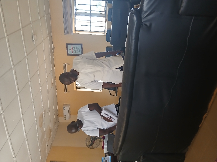 The image depicts an indoor scene in Shendam, Nigeria. Two adult African males are present in a room furnished with dark, possibly leather, couches and chairs. The room has light-colored walls, a white suspended panel ceiling showing some discoloration, and a window with security bars on the right. A wall-mounted air conditioning unit is visible above the window, and a framed item hangs on the wall between the window and a door. A black standing fan is positioned on the left side of the room. The male on the left wears a white short-sleeved t-shirt, dark trousers, and dark sunglasses. He is holding a white document or brochure with visible text and graphics, looking down at it. The male on the right wears a white short-sleeved collared shirt and dark trousers, and is also looking downwards, appearing to observe the document or an area immediately in front of him. A large portion of a black couch occupies the foreground, partially obscuring the lower half of the scene.